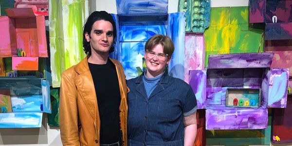 Left: Riley Strong (right) poses with friend Matthew Watkins (left) in front of "REFUGE II" at opening reception for "Repetition"